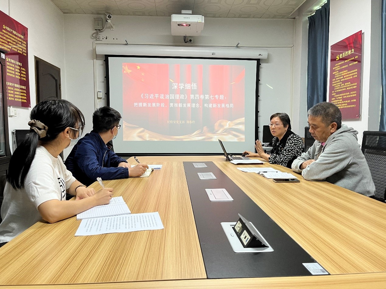 党支部书记郑春玲主持会议并专题讲授《习近平谈治国理政》第四卷第七专题。围绕贯彻习近平总书记关于“把握新发展阶段,贯彻新发展理念,构建新发展格局”的重要讲话精神,她强调,一是要着力加强对贯彻新发展理念的监督检查。弘扬伟大建党精神,坚持稳中求进工作总基调,完整、准确、全面贯彻新发展理念,主动服务和融入新发展格局,始终把政治监督摆在首位,把握大局、判明大势、抓住大事,围绕贯彻落实党中央决策部署要求和《关于加快构建新发展格局的指导意见》确定的重点任务,统筹疫情防控和学校发展,有针对性地加强日常监督,推动各级党组织和党员干部站在“两个维护”的政治高度完整、准确、全面贯彻新发展理念,切实增强推动省域高水平高职院校建设的自觉性坚定性,着力查找思想认识、工作机制、方式方法、能力作风等方面存在的问题,形成推动高质量发展的合力,让新发展理念在学校落地生根,以实际行动迎接党的二十大胜利召开;二是健全贯彻党中央重大决策部署和习近平总书记重要指示批示精神督查问责机制。要跟进监督、全程监督、精准监督,及时纠正政治偏差,坚决查处贯彻落实不力背后的腐败和作风问题,用纪律唤醒“装睡”的人;三是切实肩负起督促防范化解重大风险的使命担当。善于预见和预判各种风险挑战,围绕及时清除发展中的风险隐患加强监督检查,压实各级党组织全面从严治党的主体责任;四是从根本宗旨上把握新发展理念。坚持以人民为中心的根本立场,积极适应师生需求变化,推动监督下沉落地,持续整治群众身边腐败和不正之风,把问题解决在师生家门口,促进公平正义、保障师生合法权益,使改革发展成果更多更公平惠及师生员工,不断增强师生员工获得感幸福感安全感;五是着力营造风清气正的政治生态和发展环境。激励担当作为,推动构建亲清政商关系。坚持有腐必反、有贪必肃。突出加强对“关键少数”特别是“一把手”监督,全面规范领导干部配偶、子女及其配偶经商办企业行为,坚决查处违规兼职行为。