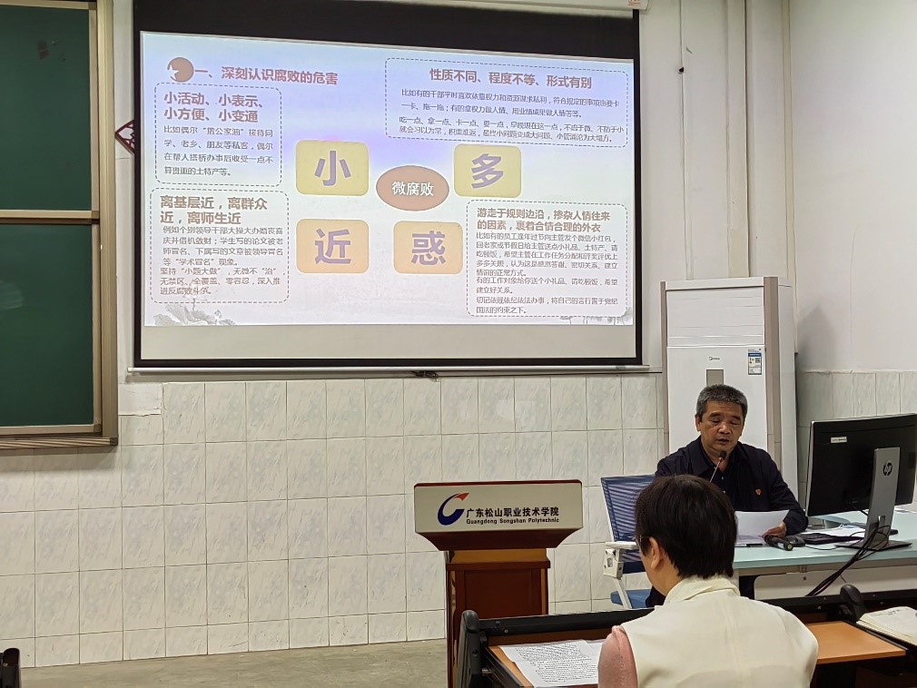 为帮助即将毕业的同学们扣好人生第一粒扣子,11月8日晚上,学校党委副书记、纪委书记谭春雨以“严守职业底线 坚持廉洁从业廉洁齐家”为题,为我校大三学生上了一堂廉洁修身课,纪检室党支部在职党员参与听讲。