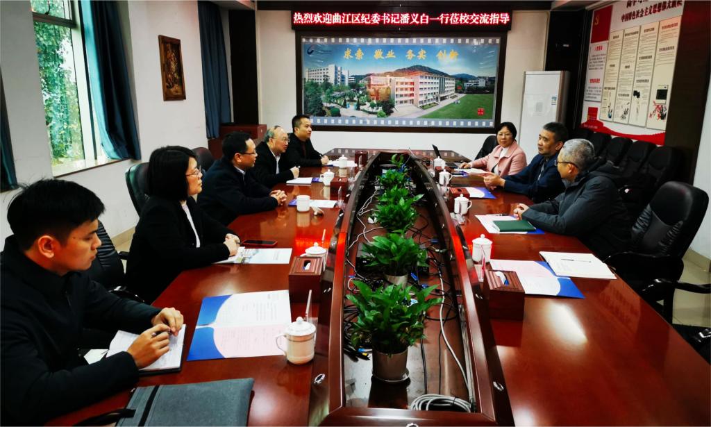 1月11日上午,曲江区委常委、区纪委书记、区监委代理主任潘义白一行5人莅校交流指导。副校级领导谭春雨,党委委员、纪委书记郭浩东对潘义白莅临我校指导工作表示热烈欢迎。纪检室中层干部参加了交流。