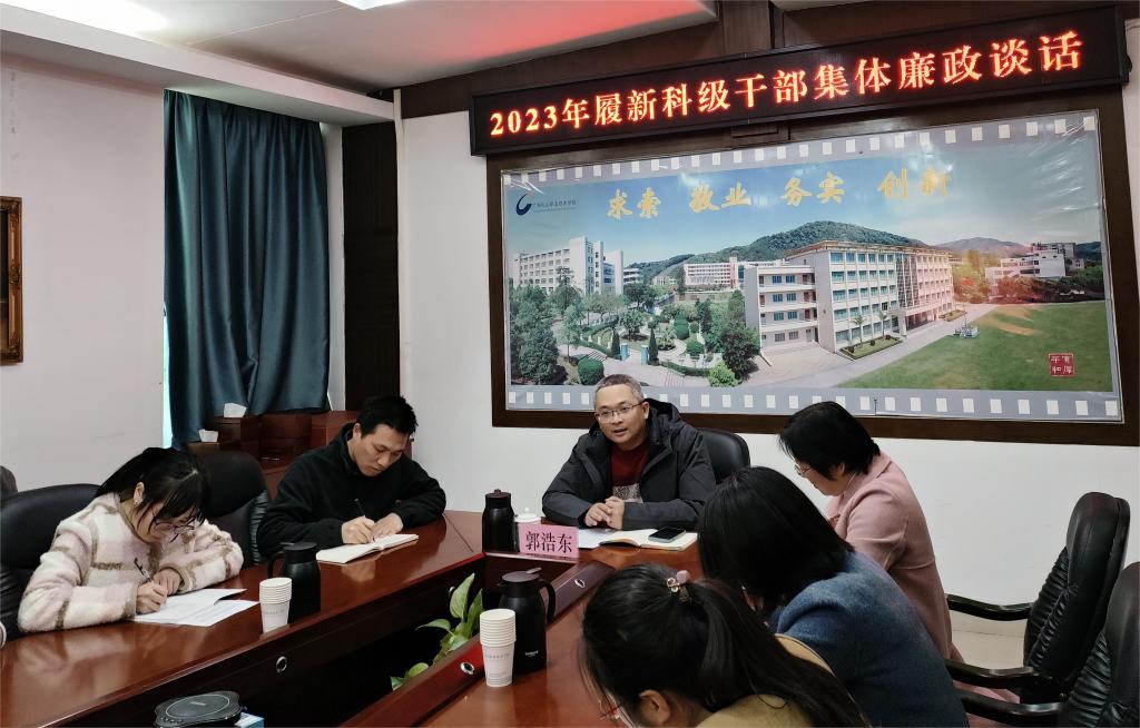 1月11日,学校党委委员、纪委书记郭浩东对2023年履新科级干部开展集体廉政谈话。纪检室主任郑春玲、副主任谭爱红一同参加了此次谈话。